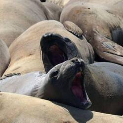 Denn wie immer kommt zuerst die Seelöwen-Vorhut an die Oberfläche gewuselt. Eine ganze Armada runder, glänzender Köpfe verteilt sich bellend im grauen Meer.