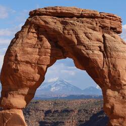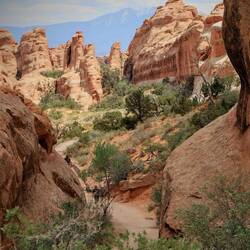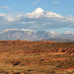 Die Straße schlängelt sich äußerst scenic durch bizarre Sandsteinformationen, passiert bereits so manchen Felsbogen, und im Hintergrund sorgen die schneebedeckten La Sal Mountains für einigen Kontrast. Es ist eine Landschaft zum Niederknien.