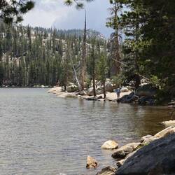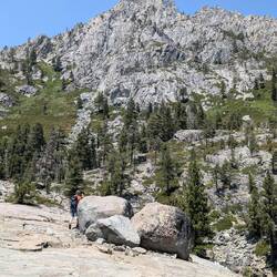 Der Vorteil am John Muir Trail ist, dass wir fast alleine unterwegs sind. Uns kommen nur ein paar JMTler mit großen Trekkingrucksäcken entgegen und eine Gruppe bepackter Maultiere. Ziemlich überraschend, wenn man bedenkt, was weiter unten am Hauptweg los ist.