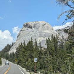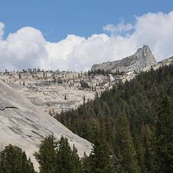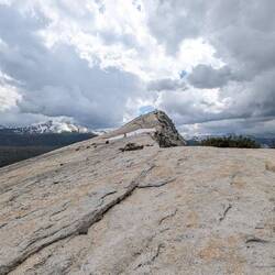 Eine Wanderung muss in dieser atemberaubenden Landschaft natürlich auch noch sein. Der Lembert Dome liegt kurz hinter den Toulomne Meadows am Tioga Pass. Hier führen sowohl der Pacific Crest Trail als auch der John Muir Trail entlang. Noch liegt zu viel Schnee, um diesen Abschnitt laufen zu können. Zudem wird der Himmel dunkel, ein Gewitter zieht auf. Statt einer gemütlichen Runde belassen wir es da lieber bei einem schnellen Aufstieg auf den Gipfel. Kommen sogar gerade so noch trocken zurück. Was für ein lohnender Abschluss unserer Zeit im Yosemite Nationalpark!