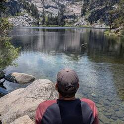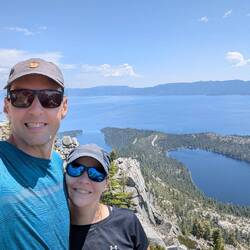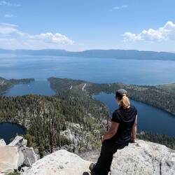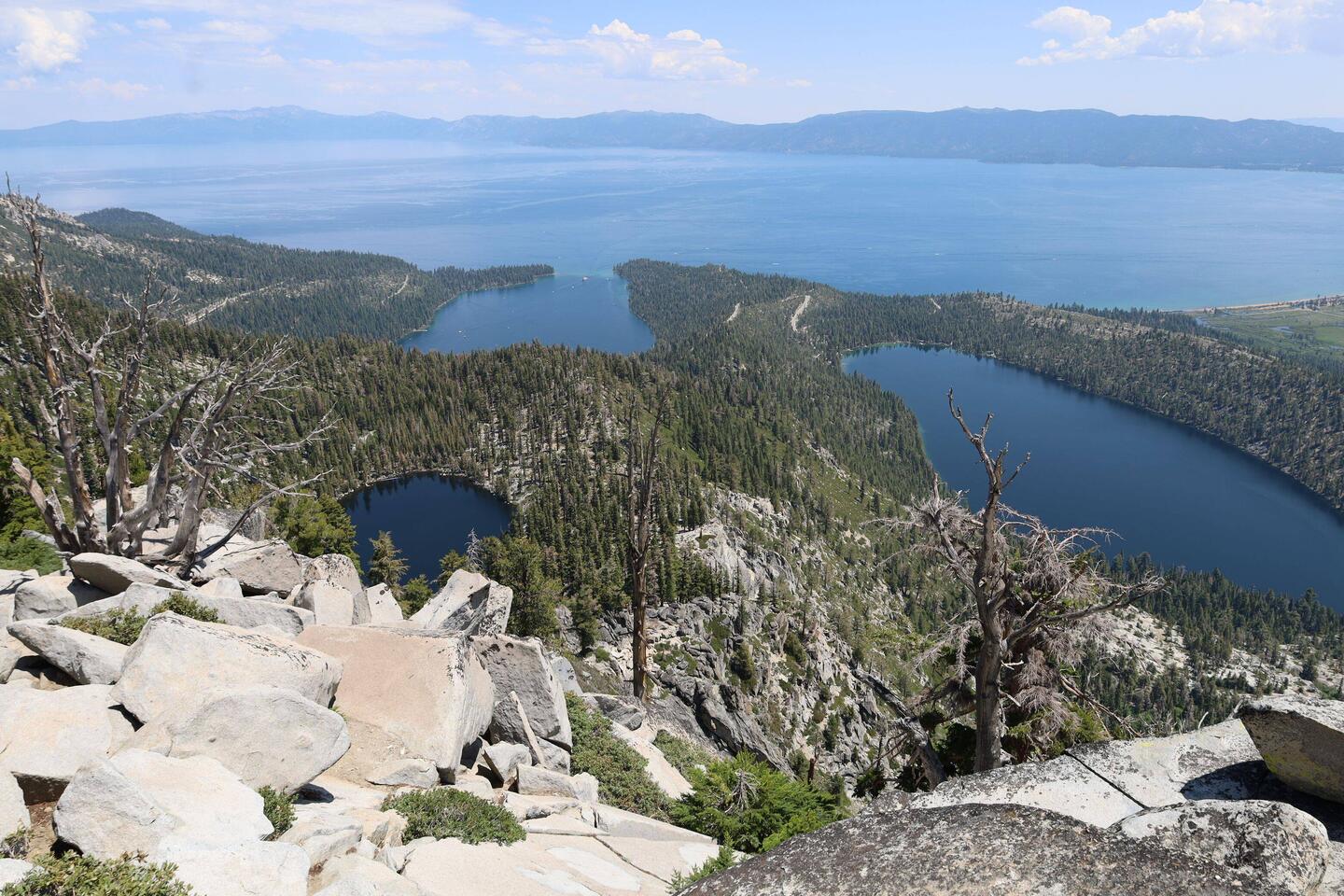Zu unseren Füßen liegen gleich mehrere Seen und natürlich Lake Tahoe, hinter uns die Bergkette.