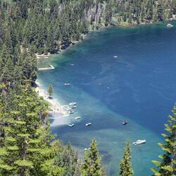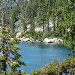 Und so fahren wir am nächsten Tag früh zum Emerald Bay State Park. Leider nicht früh genug, alle offiziellen und nichtoffiziellen Parkplätze sind schon belegt. Autos kleben meilenweit am Rand der engen Bergstraße, oft nur knapp neben dem steilen Abgrund. Mutig. Nach einer kleinen Ewigkeit finden aber auch wir noch eine vernünftige Lücke, und dann geht's los zum Eagle Lake.