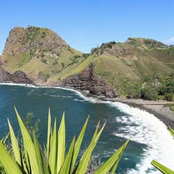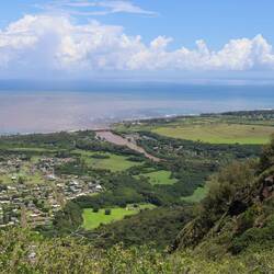 Der Aufwand lohnt sich aber: Rechts begrüßt uns tiefblaues Meer, links grüne Berge und weite, saftige Felder. Eine schöne Aussicht und eine nette kleine Wanderung.