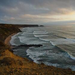 Nach 2 Tagen Großstadt zog es uns wieder ans Meer. Etwas nördlich vom Surf-Hotspot Peniche/ Baleal fanden wir einen großartigen Platz an der Küste mit einem 5 minütigem Strandzugang. Einzig der Wind pfeiffte ganz schön, den nahmen wir aber für diesen grandiosen Ausblick in Kauf! Der Strand war ewig lang, fast menschenleer und landschaftlich mit seinen rot-gelben Felsen super schön. Eigentlich wollten wir noch einmal das Surfen ausprobieren, bei 18 Grad war uns allerdings nicht so nach stundenlangem Warten im Wasser zumute, rein gehüpft sind wir natürlich trotzdem mal.