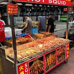 Joue 13 ! Départ en car au petit matin direction l’île de Penang ! Nous arrivons en avance au terminal de bus ! Fait étrange d’ailleurs car tout le monde nous dit qu’il ne faut pas être à cheval sur les horaires en Malaisie, qu’il y’a souvent du retard, et bien peut importe le moyen de transport nous sommes toujours arrivées en avance ! Mashallah 🤩 Avant de nous rendre dans notre guesthouse nous allons trouver un food court pour nous rassasier d’un savoureux repas car on crève littéralement la dalle sa mère. Le principe est top, tu choisies une table dans un grand hall et tu choisies ensuite parmi plein de petites guérîtes la nourriture que tu souhaites manger.
