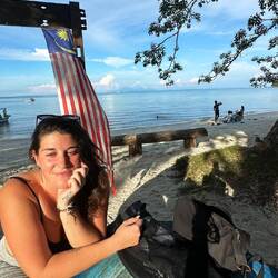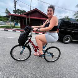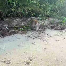 Bref bonne vibe ! L’après midi nous empruntons les vélos mit à disposition par l’auberge. Quelle aventure, moi et ma chance légendaire avec les bicyclettes, j’ai du m’y reprendre à 4 fois avant de trouver un vélo qui pouvait faire plus de 3 mètres. Ce ne fut pas chose aisée mais j’y suis arrivée 👌🏼 Nous voilà parties direction la plage, avec ma grâce naturelle je pédale cheveux aux vents et moustiques sur les dents. Arrivées au port nous apprenons que nous devons prendre un bateau afin de nous rendre sur Monkey Beach. Qu’à cela ne tienne, c’est parti pour 10 minutes de bateau à moteur afin de nous déposer sur la plage. Une petite baignade dans une eau un peu suspecte et une petite sieste sur la plage plus tard, je me fais réveiller par un macaque venu fouiller le sac à dos à la recherche de quelque chose à voler. Le bougre partira bredouille mais c’était moins une. Ils n’avaient pas menti, il y’a beaucoup de singe sur cette plage ! Nous finissons l’excursion au beach bar de fortune en attendant notre taxi bateau, une bière à la main et une atmosphère d’envie de tout plaquer pour nous aussi vendre des canettes de bière sur la plage avec comme serveurs (ou dé-serveurs) des singes un peu ronchons. Le soir venu nous allons trouver un restaurant chinois recommandé par notre hôtel, ne voulant pas trop me risquer je prends du poulet… était-ce réellement du poulet ? Seul Dieu le sait dorénavant (et le cuisinier) après quelques blagues limites et l’image de petits chatons cuisinés en poulet laqué dans mon assiette je suis incapable de continuer mon assiette. Heureusement maman a pris de bonnes crevettes royales au curry 😋 merci Josiane d’assurer mes arrières. Encore une journée forte en émotion 😍