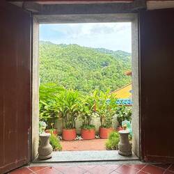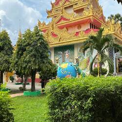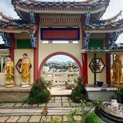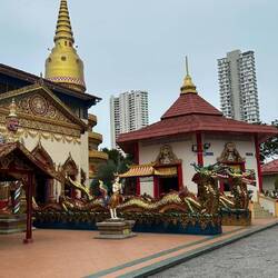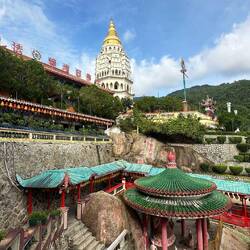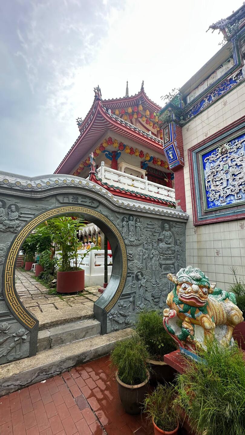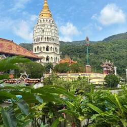 Ensuite nous prenons le bus ! On doit payer le ticket en liquide avec la somme exacte, je n’ai pas de change alors une dame dans le bus me fait gentiment la monnaie et moi j’aide un autre monsieur à qui il manque quelques centimes pour son ticket. C’est génial, tout le monde s’entraide dans ce pays, c’est pas dans une bus de la RATP qu’on verrait ça 🥲. Nous allons récupérer notre scooter afin de commencer la journée, et c’est parti ! Il fait beau et chaud. Nous commençons par visiter le temple Paya Terubong, très beau monument qui surplombe la ville et mélange donc style bouddhiste et architecture moderne en arrière plan. Et puis en plus, c’est gratuit et pas besoin de nous couvrir comme des bonnes sœurs🥳