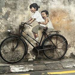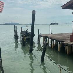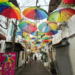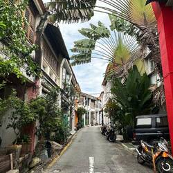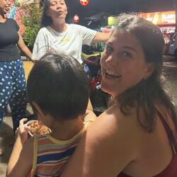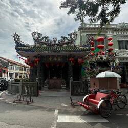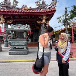 Ensuite nous retournons en ville, un autre temple une autre mosquée, et ainsi de suite, mais !! c’est gratuit (ça on aime) 🤑. Tout se ressemble un peu mais c’est sympa à voir. Puis nous nous rendons aux chew jetty, des petites maisons habitées et petites boutiques pour touristes montées sur pilotis. Telle la star que je suis, un groupe d’étudiants m’arrête dans la rue pour m’interviewer sur mon voyage en Malaisie! Ensuite nous allons manger dans un food court car il commence à faire faim. Encore une fois c’est très bon et pas cher et il n’y a que des locaux, c’est bon signe ! Puis nous partons vers la vielle ville où nous irons nous mélanger aux touristes venu faire des photos avec les œuvres de street art et les pseudos influenceurs payant leurs matcha latte 8€ au lieu de 2, mais ça va par ce que, “c’est trop instagramable🤩” anywayyyyy les rues sont vraiment toutes mignonnes mais il est tant de rentrer en passant par la plage pour rendre notre cyclomoteur. Sur le chemin de l’hôtel, nous nous retrouvons en plein milieu du night market, un marché local où se mélangent fritures, plats préparés directement sur place, fruits, vêtements,… que des locaux et une bonne odeur qui donne faim. Nous achetons de quoi manger pour le soir et nous passerons la soirée à l’auberge en compagnie d’un couple de français ayant parcouru le monde et nous partageant leurs récits plus extraordinaires les uns que les autres. En accompagnement, une petite binouse 🍺 et ma petite maman chat🐈‍⬛ à côté de moi et viendra l’heure d’aller se coucher.