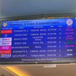 Arrivée à Cebu aux Philippines 7h du matin. 22h sans dormir. Nous allons maintenant prendre le ferry direction Bohol. Nous patientons dans la salle d’embarquement notre ferry est prévu pour 10h.
