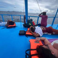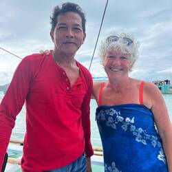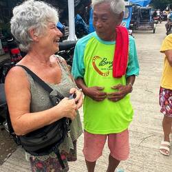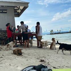 Benjie veille au grain. Ces trois jours se résument à plonger, manger, boire et dormir dans des endroits paradisiaques. Nous sommes accueilli les deux nuits dans des villages de pêcheurs et nous dormons dans des huttes littéralement au bord de l’eau. La nourriture préparée par nôtre chef est délicieuse. Notre capitaine Mario qui a conquis le cœur de Josiane est super sympa et beau gosse même s’il lui manque toutes ses chicos du haut. Josiane a du goût 😜 Nous passons d’incroyables moments en compagnie des membres d’équipage, nous buvons ensemble et apprenons tous les jours un peu plus sur leurs vies de marin.