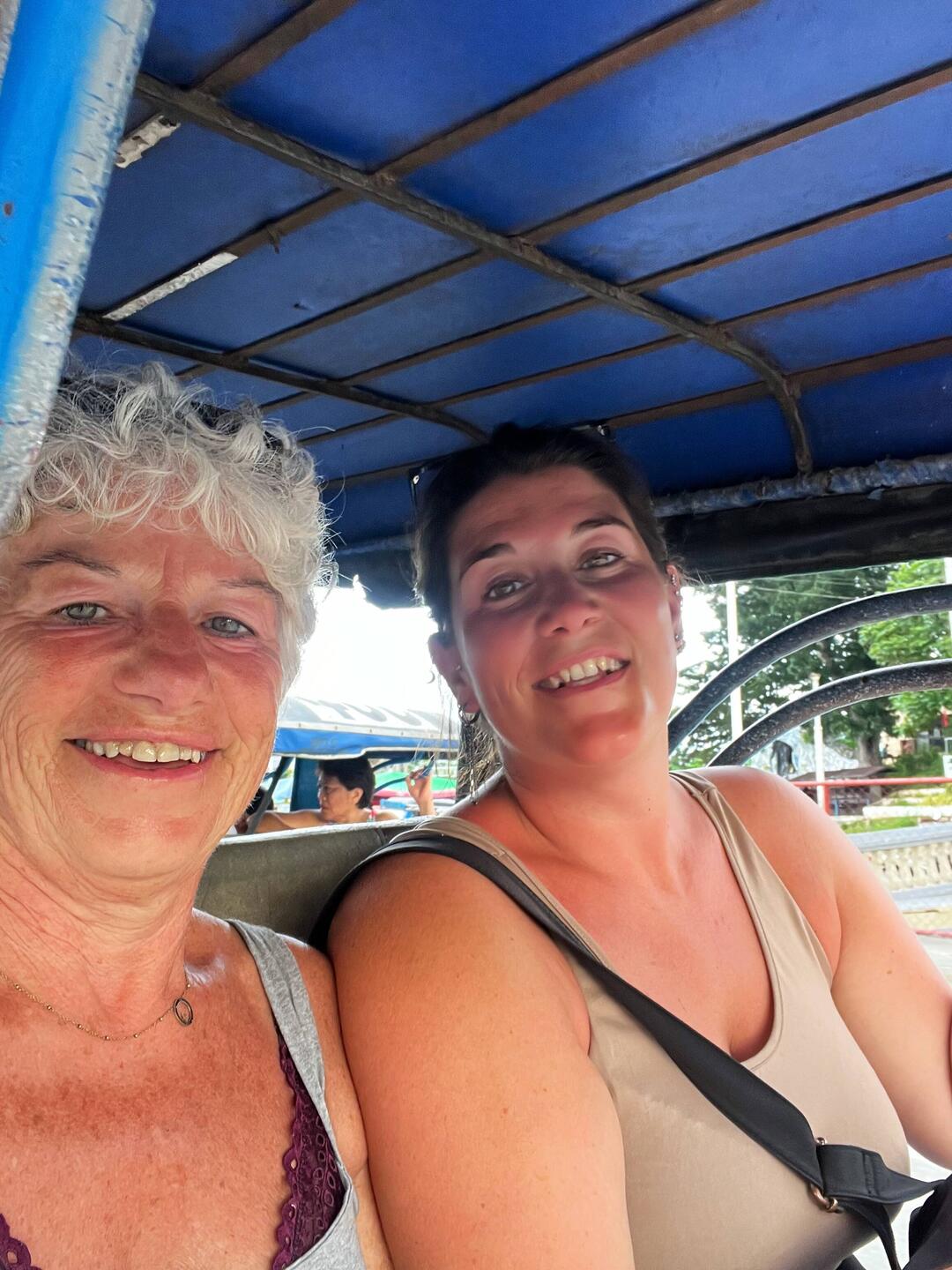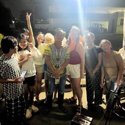 Puis nous partons direction la cascade Hagimit où nous pourrons nous baigner avec les locaux et nous détendre sous les chutes d’eau. Et nous revoilà à califourchon sur notre scooter tout terrain direction le giant clam sanctuary, une parcelle de mer où sont préservés et entretenus de géant bénitiers, selon Google c’est le plus gros mollusque bivalve du monde ! Voilà pour la minute savante. En tout cas, incroyable expérience 🤩! Et puis il fait faim ! Un petit poulet à emporter et nous voilà de retour dans notre cabane. Et le plus drôle arrive, demain matin nous devons rendre le scooter à 6h pour reprendre le ferry. On a une heure de route et deux sacs de 20kg. LOL du coup idée du siècle, on va déposer un premier sac à la location de scooter ce soir. En avant Josiane derrière moi sur notre 150cc. À porter le sac sur ses épaules, on ne la voit presque plus. Nous voilà arrivées péniblement la bas et décidons de prendre une bière a emporter. Je demande à notre locataire si on peut boire sur le trottoir et la c’est le drame. Nous voilà embarquées dans une soirée karaoke improvisée sur le trottoir avec toute la famille. Ils chantent joyeux anniversaire à maman et nous trinquons tous ensemble. Quelle soirée !! Nous avons chanté dansé et rigolé ! Mais il faut rentrer maintenant ! On a une heure de route il fait nuit et il pleut des cordes ! Youpi !