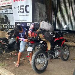 De bonne heure et de bonne humeur après une bonne douche. Nous embarquons sur notre ferry pour 15 minutes de trajet. 80 centimes le ticket ! Qui dit mieux ? Arrivée sur l’île, nous devons nous rendre un peu plus loin pour récupérer un scooter et négocier avec un chauffeur pour nous emmener nos bagages jusqu’à notre Airbnb qui se trouve à une heure au sud de l’île. Mais avant tout ça, ils nous faut un café et à manger !! Ensuite nous pourrons réfléchir et être aimable. Il semblerait que les cafés n’existent pas sur cette île, alors la boulangère nous improvise une table dans sa boutique avec du café instantané et des petits pain frais. Trop gentils ces gens ! Puis un Tuktuk nous emmène à la loc de scooter. Pour le scooter c’est ok mais pour emmener les bagages il nous demande trop cher. C’est alors que le propriétaire des scoots nous propose de gentiment (mais moyennant finance) de nous accompagner avec nos bagages ficelés à sa moto cross. Et nous voilà parti. La route est longue, surtout que Google nous fait prendre des chemins de cailloux et non de bitume, autant vous dire que ça a bien secoué tout ce qu’il y’avait à secouer. (Malin la moto cross)