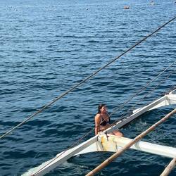 Puis nous partons à la recherche d’une plage un peu plus sauvage, ce qui est parfait car nous y croisons beaux bateaux de pêche et leurs pêcheurs et nous pouvons aller plonger avec nos masque admirer les fonds marins. Où nous observerons des petits poissons de toutes les couleurs, des énormes oursins, des étoiles de mer🤩 puis il est tant de rentrer rendre notre engin à moteur à son propriétaire, prendre une douche et aller dire au revoir au bar. C’est soirée karaoké ce soir. Tout le monde chante ! Les garçons ont tous des voix magnifiques! Le propriétaire Antonio un homme d’environ 70 ans est le meilleur chanteur, d’une gentillesse incroyable il nous partage son histoire et sa voix mélodieuse.