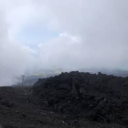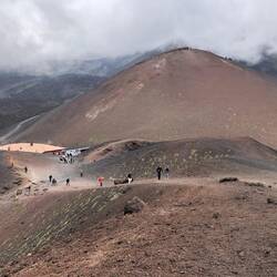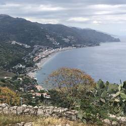 Heute sind wir sehr früh aufgebrochen und haben den Zeltplatz in Terme Vigliatore Richtung Taormina verlassen. Wir haben die traumhafte Pass-Straße durch das Landesinnere gewählt und konnten trotz Wolken eine sehr schöne Aussicht Richtung Meer und Berge genießen. Wir sind hoch bis fast 1200 Meter - die Temperatur lag am höchsten Punkt im zweistelligen Bereich, genauer gesagt bei exakt 10 Grad. Die Pass-Straße SS185 ist erstaunlicherweise sehr gut ausgebaut, fast keine Schlaglöcher - das war entspanntes Fahren nach den letzten Tagen im Süden Italiens und Sizilien. Dafür unzählige Serpentinen. Die entgegenkommenden Einheimischen gehen bei jeder Kurve davon aus, dass kein Gegenverkehr kommt. Wenn dann ein weißer Cali doch mal da ist, ist der Schrecken groß und Straße wird schon ganz schön eng. Aber die Meisten haben hier kleinere Autos und somit alles gut. Wenn den beiden Erdingern auch hin und wieder der Atem stockt.