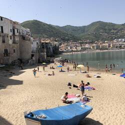 War ein bisschen voll der Strand. Wahnsinn was hier mitten unter der Woche abgeht. Die Jugend hat den Strand voll unter „Kontrolle“. Buntes Treiben mit unzähligen Palermitaner und Palermitanerinnen, Familien mit Bambinis und Händlern, die ihre hochwertigen Waren anpreisen und an die Frau bringen wollen. Alles gut Business. Obwohl die Strandtücher echt gut aussehen, die sie verkaufen. Karin hat sich eins gesichert und Klaus war für die Rabattfindung mit dem zertifizierten Händler zuständig. Good Business für beide Seiten nachdem man sich auf 10 % Nachlass geeinigt hatte. Karin und Marc hatten von der Stadt raus mit dem Bus noch eine kleine Horrorfahrt hinter sich. Der Bus war noch voller als der Strand und die beiden waren schon vor Ankunft am Strand leicht durch den Wind. Körperkontakt mit halb Palermo im Stadtbus und das Ganze mit der unendlichen Geruchsvielfalt unterschiedlicher Körperausdünstungen verfeinert - da hatten wir beide im Cali dann doch eine etwas entspanntere Anfahrt. Wir hatten allerdings die Parkplatzsuche noch vor uns. Erst wollte uns ein sehr vertrauenswürdiger Herr am Straßenrand ein Ticket verkaufen. Nö, nicht mit uns. Dann Parkplatz angesteuert. Die wollten, dass wir ihnen den Schlüssel dalassen, falls sie unser Auto umparken müssen. Klar wir gehen zur Erholung an den Strand und geben einem sizilianischen Parkplatzbetreiber unseren Schlüssel, damit der ggf. unser Auto „umparken“ kann. Guter Ansatz - zumindest mal einen Versuch wert. Dann der 3. Versuch mit harten Preisverhandlungen - wollte den Preis für ein Wohnmobil von uns haben. Wir haben aber kein Wohnmobil sondern einen VW Bus und das ist was Anderes. Vor allem kostet das Parken mit Wohnmobil doppelt soviel wie mit PKW. Also wieder in den Cali rein und wir wollten uns den nächsten Parkplatz suchen. Letztendlich wurden wir uns doch einig, dass unser Bus lediglich ein „Big Car“ ist und die PKW-Konditionen auf dem Parkplatz gelten. Geschafft. Endlich ab zum Strand.