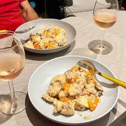 Uns gefällt es hier sehr gut. Die Bordküche serviert heute Hühnerrisotto mit Rosé im Risotto 😋 und da nicht der ganze Wein ins Risotto passt … 😊🥂