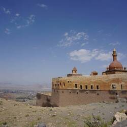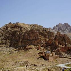 Hemos llegado a dormir. Donde se ve la auto en la foto es el aparcamiento para dormir. Mañana visitaremos el monasterio con el monte Ararat al fondo