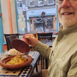 Wonderful Morrocan dinner with tagine, salad, and hummus while a downpour burst outside. What good timing!