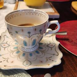 Later, the host invited me back in out of the rain (there were no other customers). I felt badly for staying for HOURS, but I didn't want to buy anything else, so I did just come in. Martin & I talked a bit. He's from Romania (!!!) by way of Dubai (!!!). I gave him a trading card, and he said he hoped we would meet again - even if it wasn't along the CW. 😊