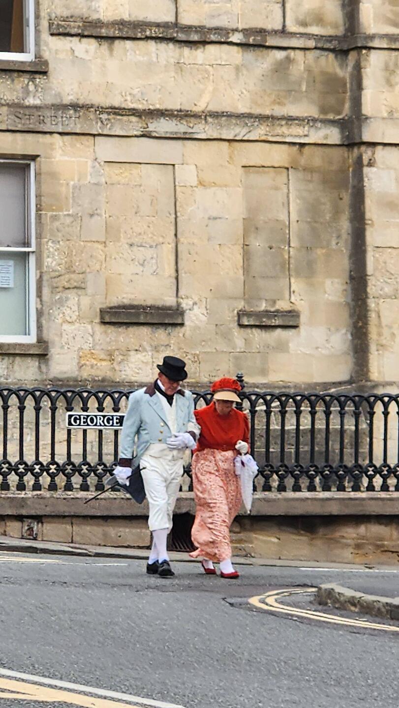 It started raining lightly while we were there, so we reconvened under an overhang once outside again. A&E went off to figure out Monday's visit to Stonehenge, and Joe & I headed to a Vodafone shop to figure out why we weren't getting internet access despite having purchased unlimited data. The clerk figured it was the heavy use happening at the time: with 2 universities starting up with attendant parents and siblings in town to settle the new students in, as well as a big rugby game in town, along with the Jane Austen 250th birthday festival, she figured the system might be overwhelmed. Joe has his doubts about that explanation, but at least it doesn't appear to be operator (aka me) error.
