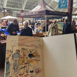 After a light breakfast, we went to the Green Park Station market, a kind of combo farmers' and flea and craft market, surrounded by small shops. Did some sketching while Davina and the fam chatted over coffee and tea, and then Simon joined.
