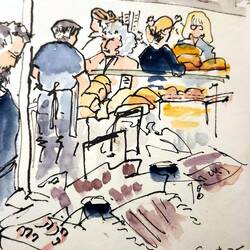 Met the baker I sketched. His reaction was, "Am I really that gray in back?" with a laugh. Honestly, if I'd seen his blue blue eyes and bushy beard from the front at the start, I would have sketched his face! Apparently, that's the second time someone has sketched him, the first time being while he was having a smoke in a pub.