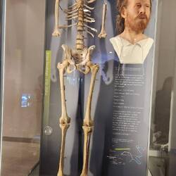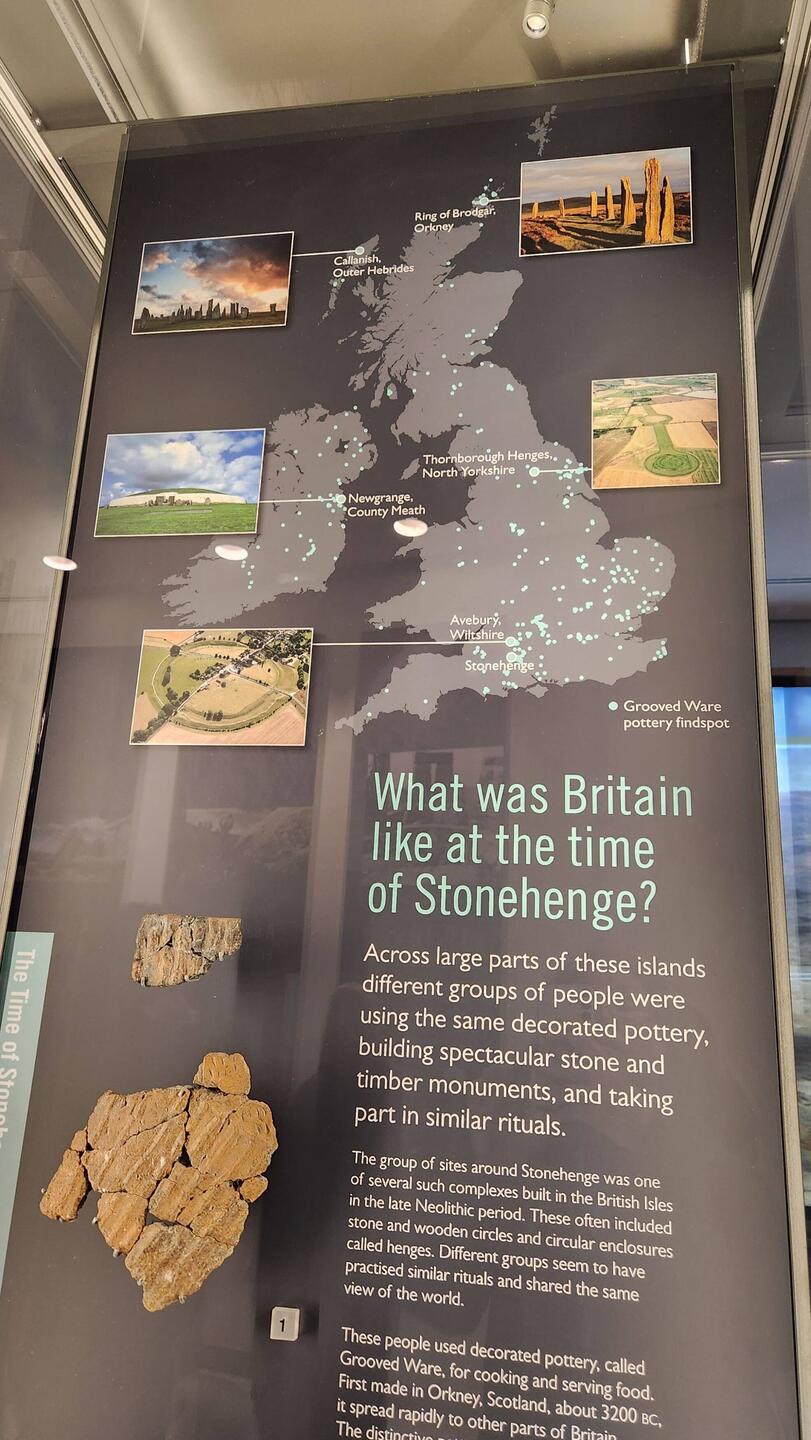 The exhibit hall at the visitors center was fantastic, detailing the origin and development of the stones as well as what is known about human daily living of the time. They even had a human skeleton from the time and area and made a best-guess likeness of his face. Lots on the tools used to dig the trenches that encircle the stones and some replicas of what archeologists think their homes in a nearby village would have looked like.