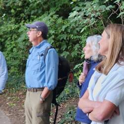 LOTS of folks walking in the a.m., along with the same two horse women from yesterday in Stanton. After acres and acres of the golf course was a nature preserve, with the path headed mostly downhill. Birds were singing up a storm - got to see a European Goldfinch and a Dunnock (a "drab little brown bird," according to the Merlin app. 🤣)