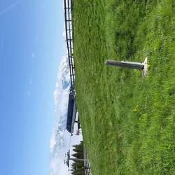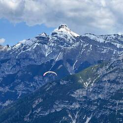 We took the Elferbahnen cable car from where we are at about 3400 ft to 5400 ft up,the mountain. Fun ride and paragliders everywhere! We walked around the area, taking in the huge wooden sundial, watched a lot of paragliders take off with their colorful chutes and raise with the air - so silent. Beautiful! Lots of trails take off from this location. We decided to take the one up to the Elferhutte, a building we could see from our restaurant at dinner last night. Quite the climb, but only about a mile. What great views and more paragliders. Took pictures, talked with some of the other people coming up the hill and walked a bit further up and then started our decent. Our quads got a real workout with the steep,part of the downhill. But we made it 👍 and we were very proud of ourselves.
