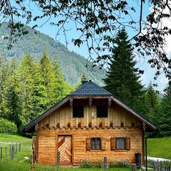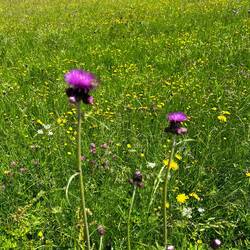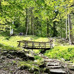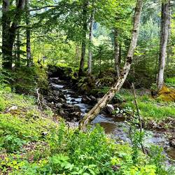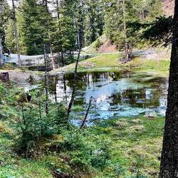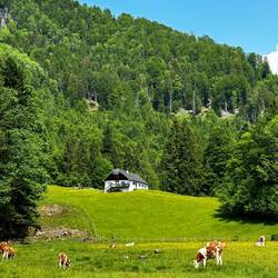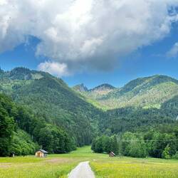 A very good day. Wonderful weather - high of 72 and sunny- perfect for me. Came to this area to hike so off this AM for one of the hikes on the tourist information brochure. Drove to a mountain lake up in these “little” Alps and planned to walk around the lake - Schwarzensee - a bit less than 3 miles. A beautiful spot, not many people; peaceful and serene. Only walked about 30 minutes and there is a cafe! Just there for the hikers and bikers. Lots of people on bikes- the trails go everywhere- from very easy to very hard. The pics today are mostly of the scenery on the hike. About 2 miles around the was a path going the opposite direction and the sign said Moosalm - 20 minutes. Hiking signs here are in time not mileage. What a great detour. Meadows filled with wildflowers of every color. The Alpine wildflowers are small so they do not show up well on a picture as there is so much green around them. Then a bit through the woods and soon arrived at Moosalm - and another cafe. No road anywhere in site.