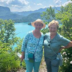 A beautiful warm, sunny day and we are off to walk around the lake. (~3-4 miles). There is a wide gravel path all the way around. Lots of people walking and biking as it’s a Saturday. The dominant feature of the lake is a small island with a church taking up most of the island. We took a Plenta (type of “man-propelled” boat) over to the island, walked up,the long set of stairs to go into the church. The draw to this church is the long, heavy rope in the middle in front of the altar. You can pull on it and make the church bells ring. See pic of the little girls. We both got the bells to ring as well. 😌. Then back on the boat and to shore to continue our walk.
