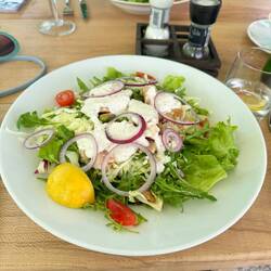 Dinner on the water at the hotel. Great salad with good fish from the lake. A great “pour” of local wine - the smallest you can order is 1/4 liter - 1/4th of a bottle. 😂. Only needed 1 tonight. Actually the local wine was quite good. Germany makes some good whites.もっと詳しく