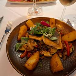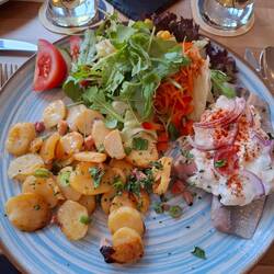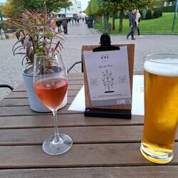 Wir haben Glück, die letzten beiden freien Plätze. Der Wein ist fein, Achims Zander auch,ich bin nicht ganz so glücklich, die Kartoffelecken waren nicht gut, nur das Lachsfilet und das Grillgemüse. Dabei war es das mit Abstand teuerste Essen.
