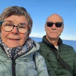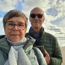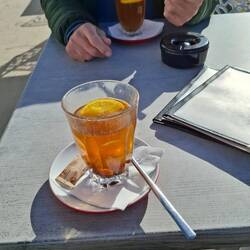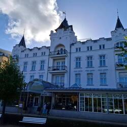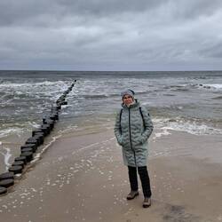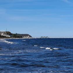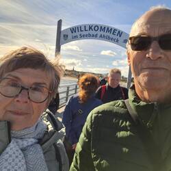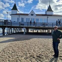 ...haben wir heute auf dem Plan. Vor allem, weil die Sonne seit früh morgens scheint. Also nach dem Frühstück die Wanderschuhe angezogen und los geht es. Gleich ab ans Wasser, das hatten heute viele andere auch vor. Die Wellen sind heute ziemlich weit auf dem Strand vorgedrungen. Man muss an der Wasserkante höllisch aufpassen, das die nächste Welle nicht die Schuhe überspült...Das gibt die ganze Zeit lustige Hüpfer...😅 Aber total schön ist es heute ,zu laufen. Die Wellen brechen sich vor den Füßen, der Himmel so blau, nur paar kleine Wölkchen, die Sonne spiegelt sich in den entstandenen Wasserpfützen...Die Seebrücke von Heringsdorf entfernt sich ,dafür rückt die von Ahlbeck immer näher. Die schönen weißen Villen leuchten in der 🌞. Wir betreten gleich die Seebrücke, um nach vorne zu laufen. Doch halt, die Sonne scheint so schön,da könnte man doch auf der Terrasse was Nettes trinken. 😉 Der weiße Glühwein mit Rum und Rosinen, der kommt jetzt gut.😋 war er und die Sonne so warm ,das ich die Jacke ausziehen musste.Wir waren fast die Ersten, die sich gesetzt haben .Innerhalb von wenigen Minuten waren alle Tische voll.😂 Nach der Pause kurz ans Ende der Seebrücke und auf der Promenade ein Stück weiter spaziert. Der Stand mit Fischbrötchen kommt uns gerade recht, das Matjesbrötchen so lecker....Wir laufen noch bissel durch Ahlbeck, vor ca.20 Jahren hatten wir mal eine Fewo hier.Aber der Wiedererkennungswert ist niedrig. 😉