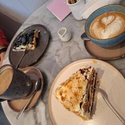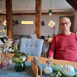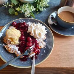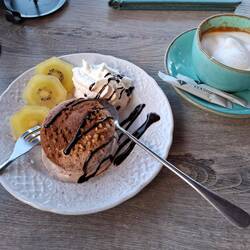 Wir fahren zurück ,bei Rewe vorbei, Kleinigkeiten besorgen. Gleich daneben fällt mir ein schönes Kaffee ins Auge.Da finden wir tatsächlich einen Tisch für 2, genießen eine schönen Kaffee und ein Stück Kuchen.Für heute waren wir genug unterwegs, ab nach Hause.Das Auto wird wieder a uf dem Berg abgestellt.