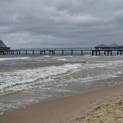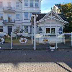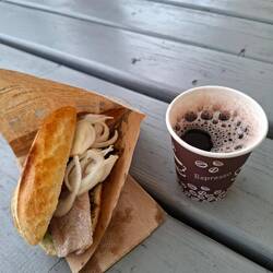 Ungefähr in der Hälfte, die Seebrücke Heringsdorf ist schon näher gerückt, gibt's Fischbrötchen. Also, 2 Gourmet- Matjesbrötchen, einen Glühwein und einen Jagertee...Danach sind wir happy, war saulecker.😅 Weiter zur Seebrücke , in der Mitte sind Geschäfte, wie in einer Passage kann man durchlaufen. Nix gekauft.🫢 Einmal bis nach vorne, da weht der Wind heftig, schnell wieder zurück.