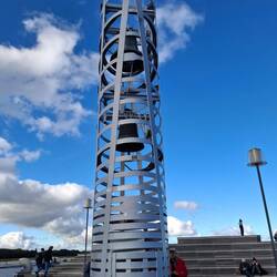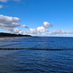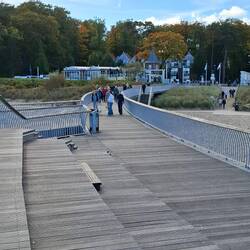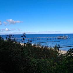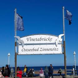 Da wir vor Jahren schon mal in Zinnowitz auf dem Campingplatz waren und mit dem Rad in Koserow ,ist es eigentlich unerlässlich, das wir mal nachgucken, wie es heute so aussieht. Der erste Eindruck vom Parkplatz zur Seebrücke...Alles wie gehabt, nur bissel erweitert, die erste Fischbude mit Dachterrasse. Als wir allerdings auf die Seebrücke wollen,sind wir baff...Alles neu macht der Mai....😅 Ne, natürlich nicht. Die Gemeinde hat es tatsächlich geschafft, innerhalb von nur 2 Jahren !! eine neue Seebrücke hinstellen lassen.Und das such noch in der Corona-Zeit, von 2019 bis 2021. Alle Achtung! Schön sieht sie aus, völlig anders als die anderen an der Küste. Nämlich nicht gerade ,sondern geschwungen zieht sie sich ins Meer. Mit einem Glockenturm ,in dem zwei Glocken aus Niedersachsen hängen. Der Geschichte von der versunkenen Stadt Vineta nachempfunden. Zufällig waren wir gerade 16.10 Uhr dort, als die Glocken zu klingen anfingen.