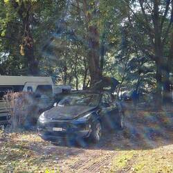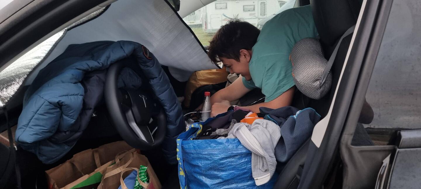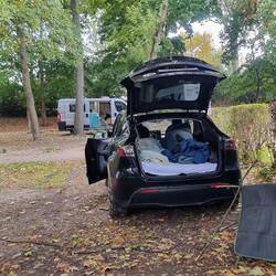 Los geht es nach Paris. Wir werden die erste Nacht auf dem Campingplatz im Tesla übernachten.