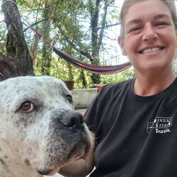 Cerberus ist laut Sage der 3köpfige Wächter der Unterwelt und dieser Cerbero hat halt 3 Beine 😄. Deswegen auch der Name. Er sieht auch ein wenig wie ein Höllenhund aus, aber ist eher ein Riesenbaby und kriegt das ganz gut hin mit seinem Handycap, auch wenn es chronische Schmerzen verursacht.