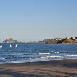 Am Morgen machen wir eine kleine Wanderung zum nahen Cape Hillsborough, das durch sein türkises Wasser besticht. Über den Strand zum Outlook über das Meer, in dem Wale vorbei ziehen.