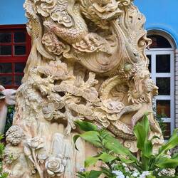 Nach der Tour sind wir nach Ninh Binh City gefahren, um mal in einem riesigen Supermarkt (GO!) einzukaufen und die Altstadt zu besuchen. Die Oldtown liegt an einem Fluss und Blickfang sind die 2 Pagoden und der Hügel auf der Insel im Wasser. Die Pagoden sind noch jung, aber äußerst reich dekoriert mit plastischen Reliefs, die Geschichten erzählen.