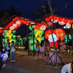 Die gezogenen Wörter werden gesungen und von einem lustigen Mann kommentiert. Ist ein ganz schöner Gaudi. Ich habe 2 Fähnchen, aber der Mann neben mir bekommt sein 3. Fähnchen schneller und gewinnt. Was gewinnt man? In Hoi An eine schöne Laterne 🎐