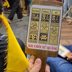 Abends gehe ich zum vietnamesischen Bingo. Man kann Holzstücke mit 3 Wörtern darauf erwerben (günstig) und wartet welche anschließend gezogen werden. Hat man eine Übereinstimmung bekommt man ein Fähnchen. Hat man irgendwann alle drei Wörter, dann hat man gewonnen.