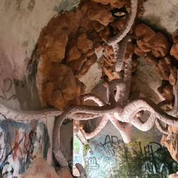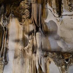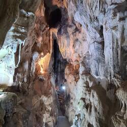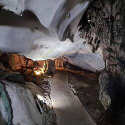 Wir gehen durch eine Höhle, die an manchen Stellen mit weißen glatten Fels aufwartet, der wie die Haut eines Wals aussieht.