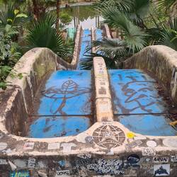 Alle Gänge und Treppen (und davon gibt es viele) sind eng und gewunden und man arbeitet sich durch zahlreiche unterschiedliche Kammern und Bereiche immer weiter nach oben, bis man in einem verrückten Garten landet (mittlerweile ist es hier 10-15m breit), der dann auch nochmal 5 Etagen hat. Total verrückt. Verabredet man sich mit Leuten in der Maze Bar, findet man sich garantiert nicht so einfach. Ich brauche schon 10Min um das Klo zu finden. Aber mir gefällt das verrückte Konzept total gut. Auf der obersten Terrasse lassen wir uns nieder, genießen einen Rotwein und den Ausblick über die Stadt, der noch vom Sonnenuntergang gekrönt ist. Ganz fantastisch.