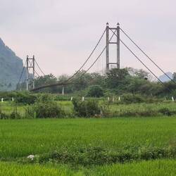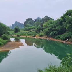 Alles ist flach, also top fürs radeln und es ist schön hier. Sogar richtig schön. Kleine Berge bzw. Kegelfelsen und flache Reisfelder mit Flüssen überall bieten ein herrliches Panorama.
