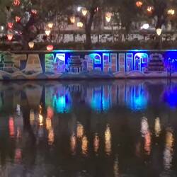 Dann gehen wir auf den Nachtmarkt um was zu essen. Hier gibt es alles Mögliche und vor allem viele Menschen. Der See nebenan spiegelt die bunten Lichter von angestrahlten Bäumen am Ufer und der allgegenwärtigen Laternen wider.