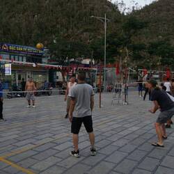 Auf unserem Weg durch die Nachbarschaft kommen wir am See der Stadt an Volleyball-spielenden Männern vorbei, die uns einladen mit zu zocken. Alles klar. Da machen wir mit.
