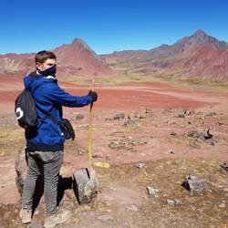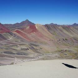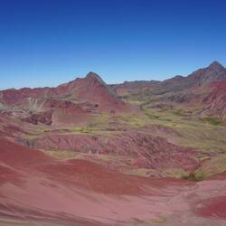 Dann beginnt der Abstieg und die Wanderung entlang der anderen Bergflanke, was ich ebenso phantastisch finde, wie den Rainbowmontain selbst. Wer hier keinem Guide dabei hat und damit keinen Zeitdruck könnte auch noch weiter in das Tal zum roten Fluss. Die rote Färbung kommt vor allem durch Eisen, gelb ist Zink und das Grün durch Kupfer. Die mosbewachsenen Hänge des Tals kontrastieren einmalig mit dem roten Untergrund. Und trotz der Höhe geschuldeten tiefen Temperaturen könnte ich hier ewig bleiben. Leider lässt das die Zeit nicht zu...