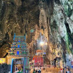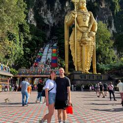 Am nächsten Morgen ging es für uns mit einem Grab (Fahrdienst) zu den Batu Caves. Das sind Kalksteinhöhlen, die als religiöser Ort der Hindus gilt. Die größte ist die 100 Meter hohe sogenannte Tempel- oder Kathedralenhöhle, in der mehrere Hindu-Schreine zu finden sind. 272 steile und bunte Treppenstufen führen vom Vorplatz hinauf zum Eingang dieser Haupthöhle. A den Schreinen saßen Familien auf dem Boden, aßen mitgebrachtes Essen oder brachten verschiedenen Göttern Opfergaben von Geld über Essen bis hin zu lebendigen Hühnern. Solch einen Schrein durften wir nur ohne Schuhe betreten. Aus dem gesamten Gelände waren wir von Javaneraffe umringt, die sehr zutraulich waren. Nach den Höhlen ging es für uns auf den Kuala Lumpur Tower (Menara). Dieser ist mit 421 Metern der höchste Fernsehturm Malaysias und der siebthöchste der Welt. Von dort hatten wir bei strahlendem Sonnenschein eine tolle Sicht über die Stadt. Die Skybox mit dem Boden aus Glas habe ich ohne Tommy ausprobiert. 😉